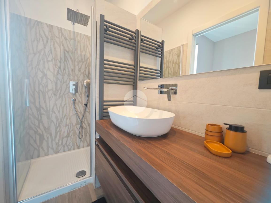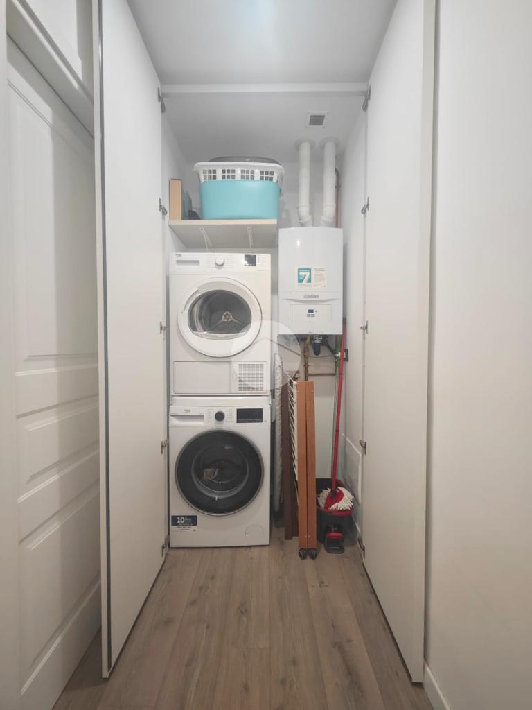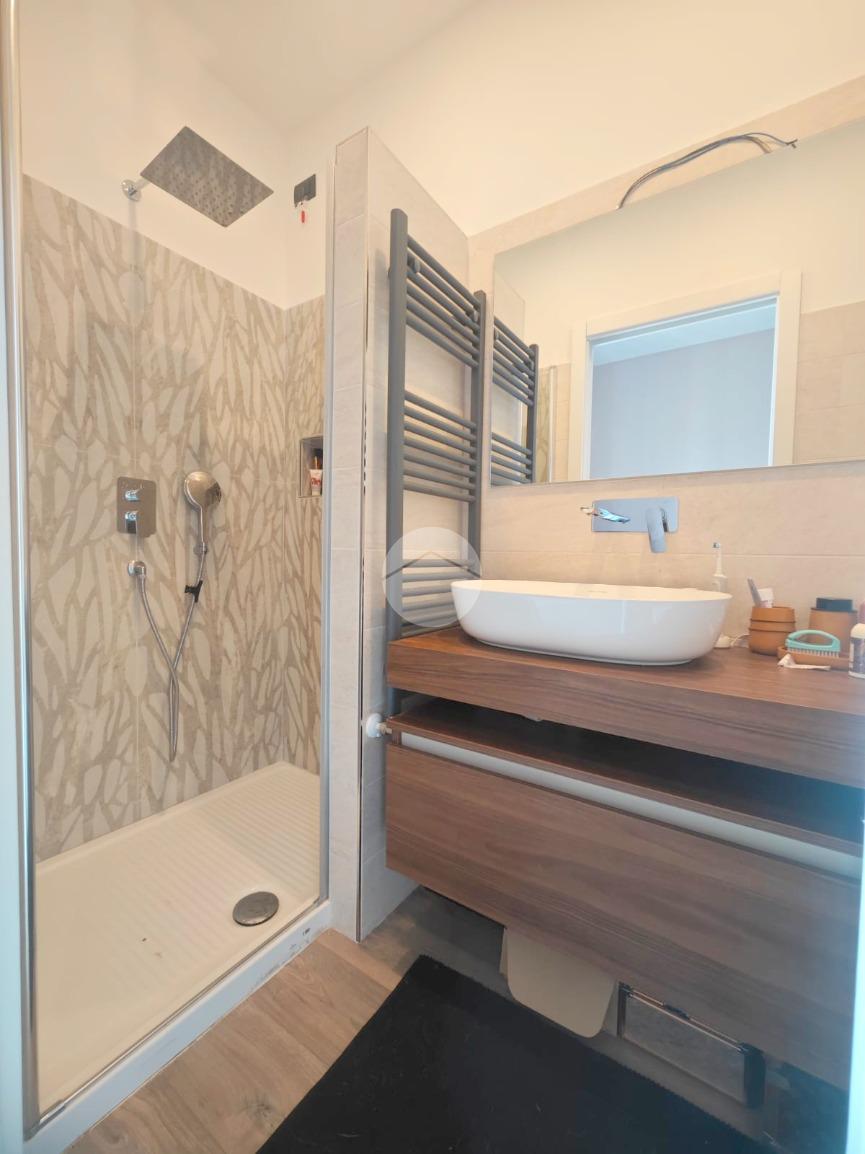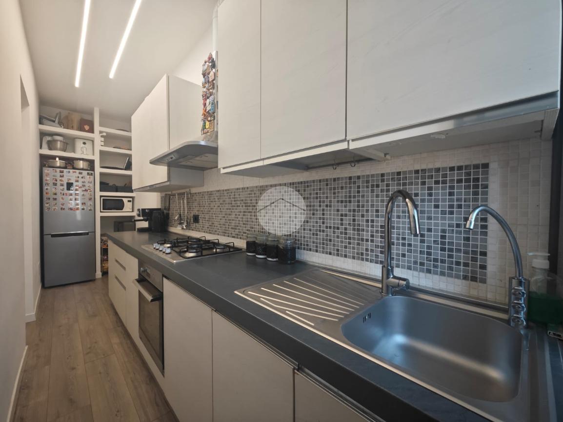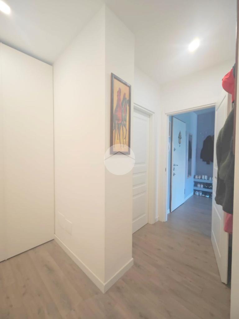 La cucina, separata dalla zona giorno, è pensata per un utilizzo pratico e funzionale, senza rinunciare allo stile. La zona notte è composta da due camere da letto, di cui una matrimoniale con cabina armadio su misura, e da un bagno moderno con doccia. Un pratico disimpegno ospita una nicchia attrezzata per lavatrice e asciugatrice, perfettamente integrata e discreta.
