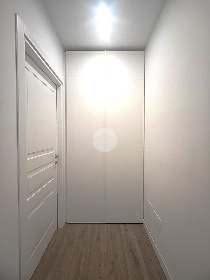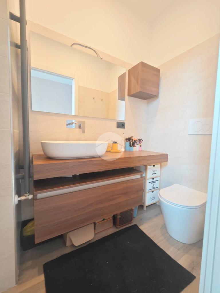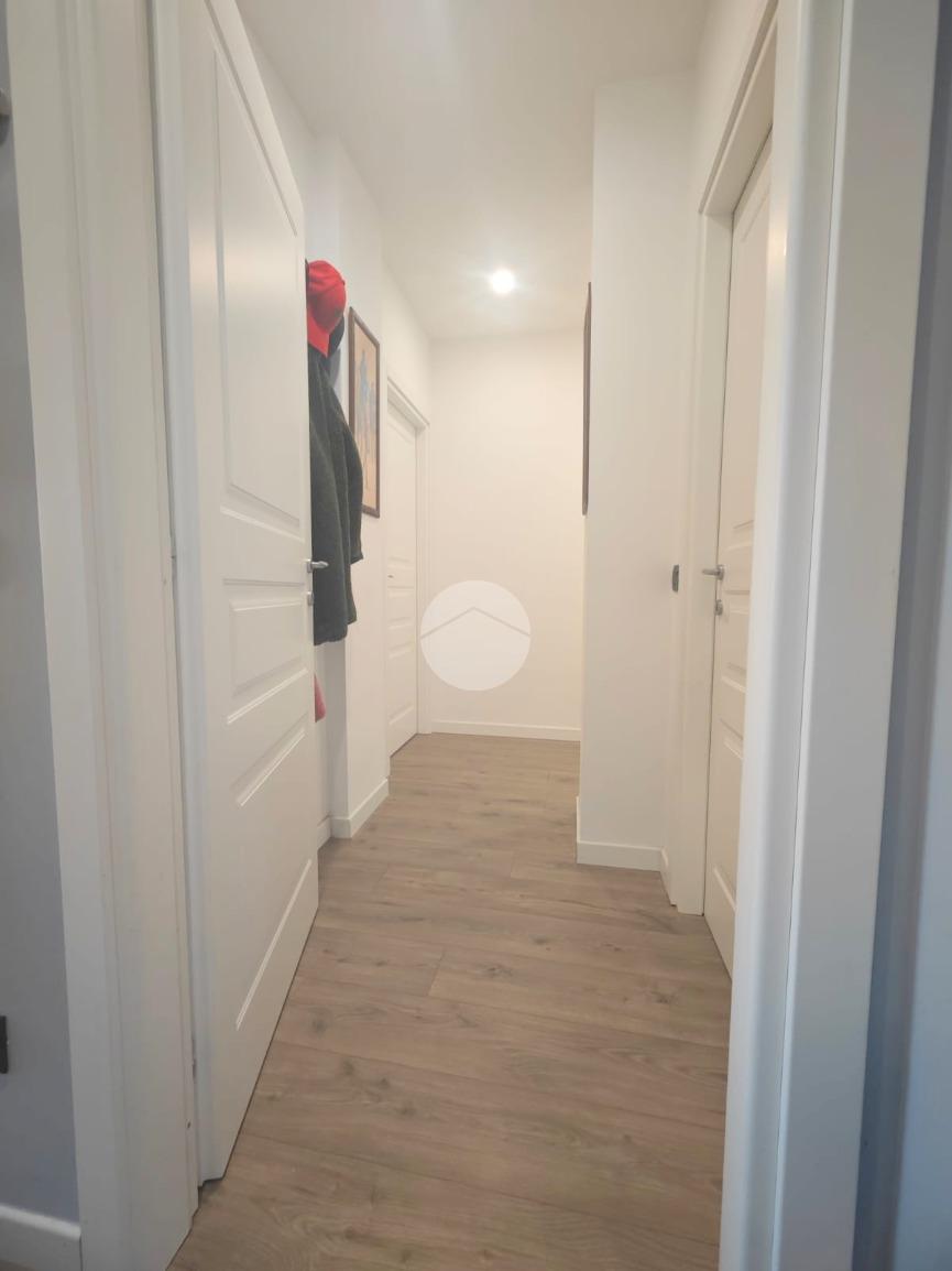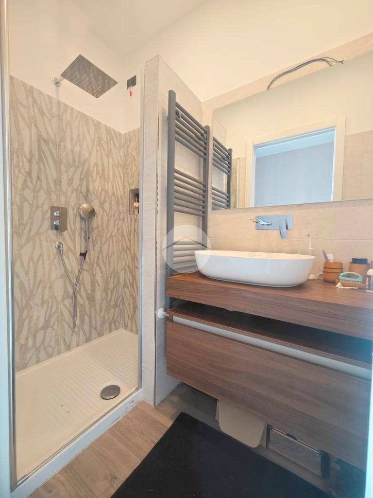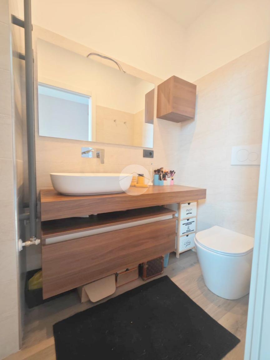 La cucina, separata dalla zona giorno, è pensata per un utilizzo pratico e funzionale, senza rinunciare allo stile. La zona notte è composta da due camere da letto, di cui una matrimoniale con cabina armadio su misura, e da un bagno moderno con doccia. Un pratico disimpegno ospita una nicchia attrezzata per lavatrice e asciugatrice, perfettamente integrata e discreta.