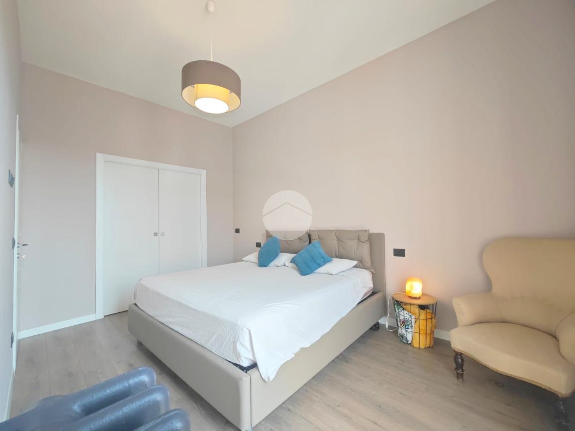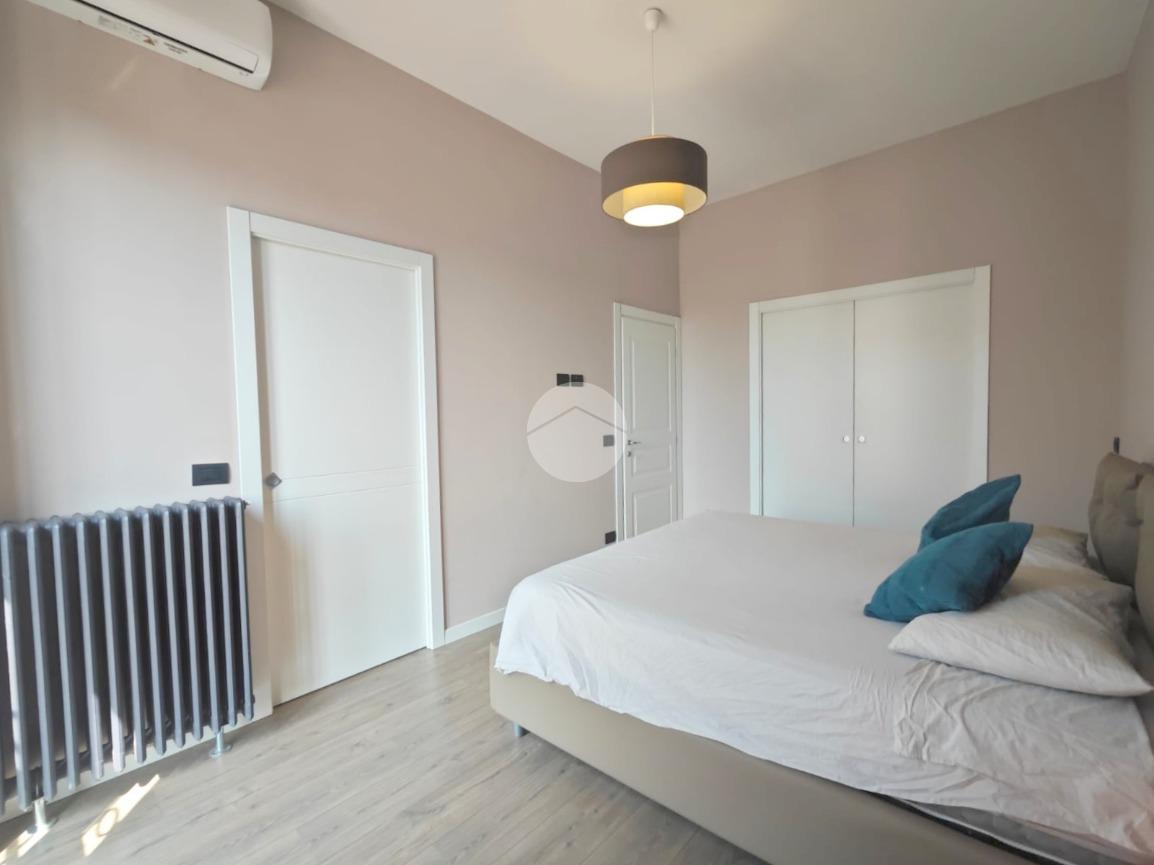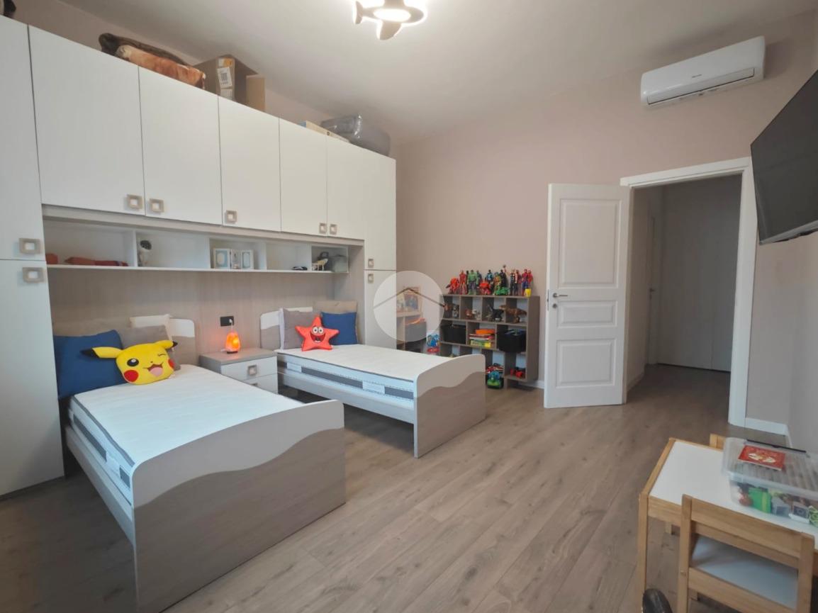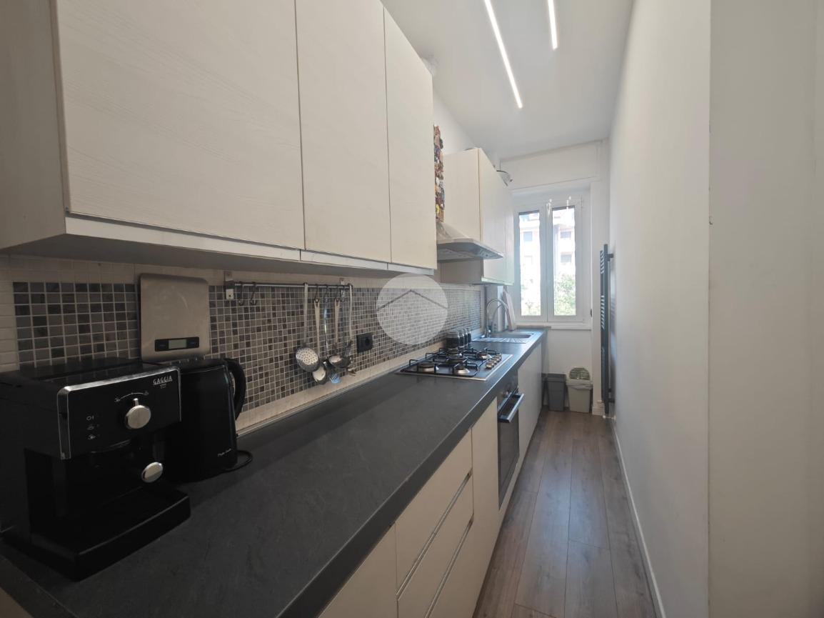 La cucina, separata dalla zona giorno, è pensata per un utilizzo pratico e funzionale, senza rinunciare allo stile. La zona notte è composta da due camere da letto, di cui una matrimoniale con cabina armadio su misura, e da un bagno moderno con doccia. Un pratico disimpegno ospita una nicchia attrezzata per lavatrice e asciugatrice, perfettamente integrata e discreta.