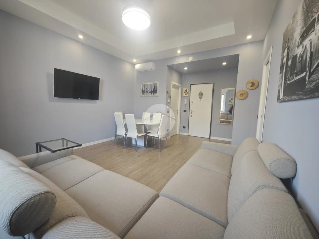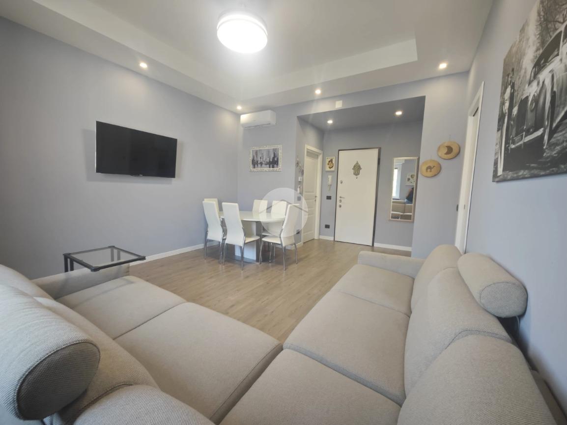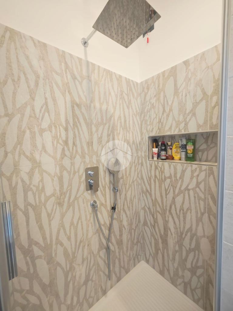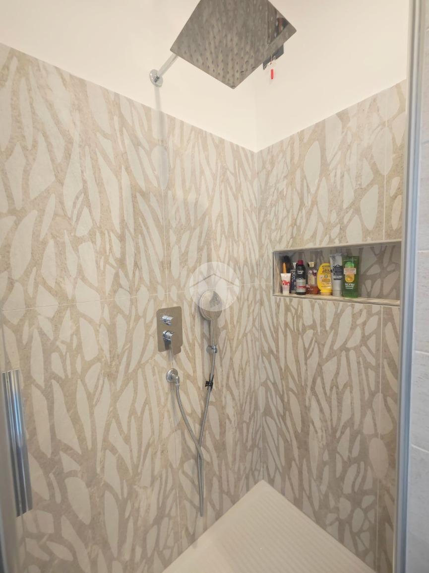 Attraverso una scala in granito si raggiunge il primo piano, dove si sviluppa l’appartamento, completamente ristrutturato nel 2024 con finiture moderne e impianti nuovi. L’ingresso avviene tramite porta blindata e si apre su un luminoso soggiorno, impreziosito da controsoffitti con illuminazione integrata e pavimentazione in laminato effetto legno che dona calore e continuità visiva agli ambienti.