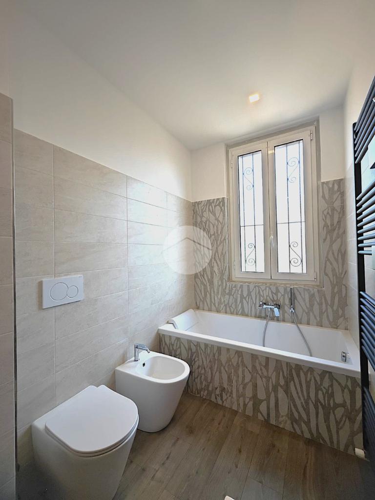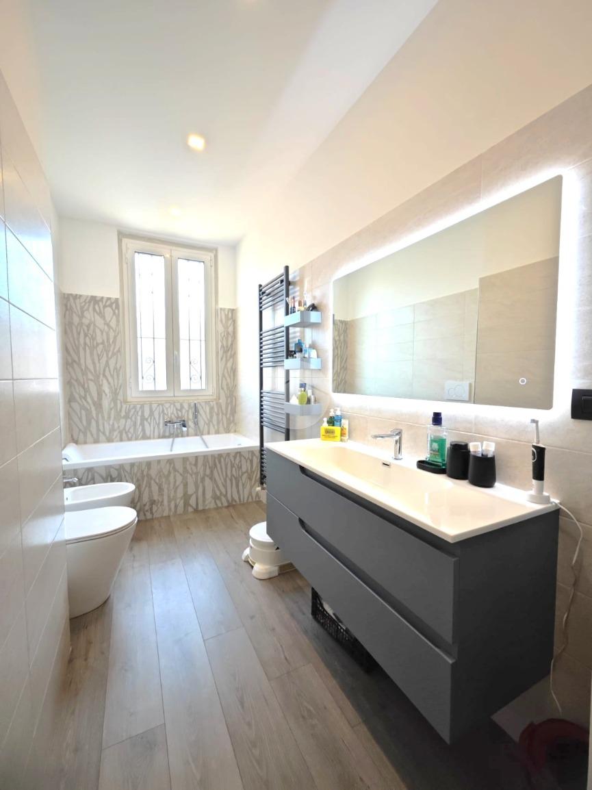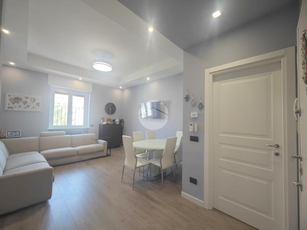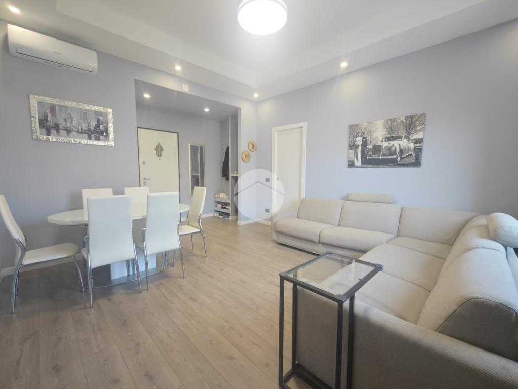 Attraverso una scala in granito si raggiunge il primo piano, dove si sviluppa l’appartamento, completamente ristrutturato nel 2024 con finiture moderne e impianti nuovi. L’ingresso avviene tramite porta blindata e si apre su un luminoso soggiorno, impreziosito da controsoffitti con illuminazione integrata e pavimentazione in laminato effetto legno che dona calore e continuità visiva agli ambienti.