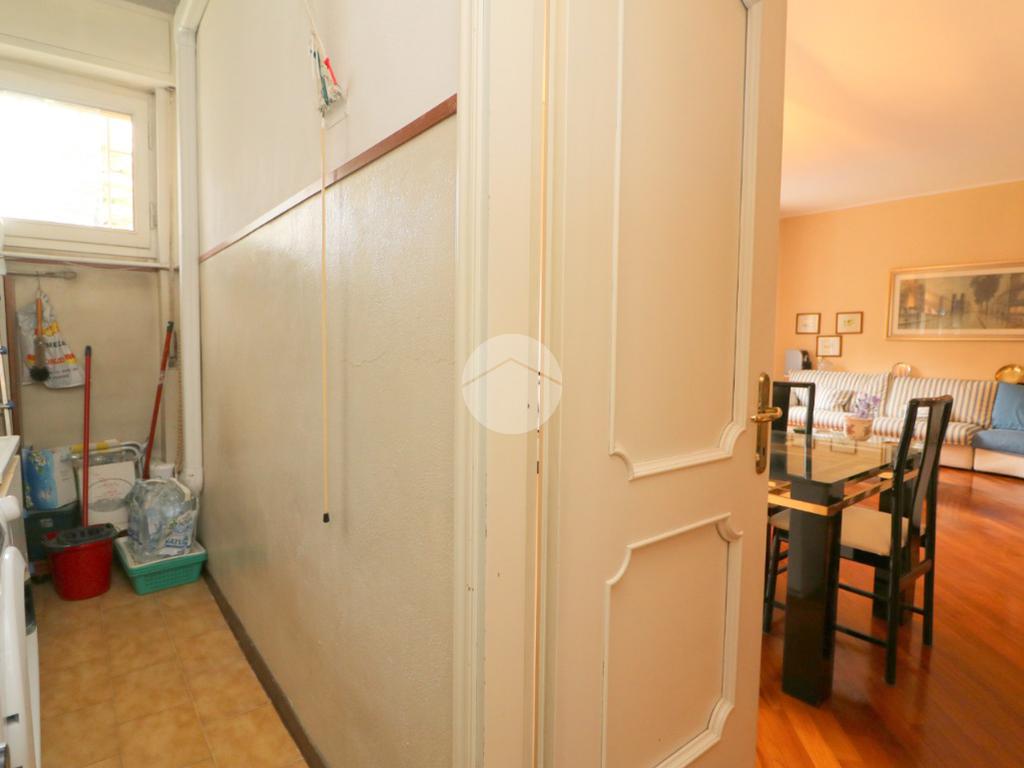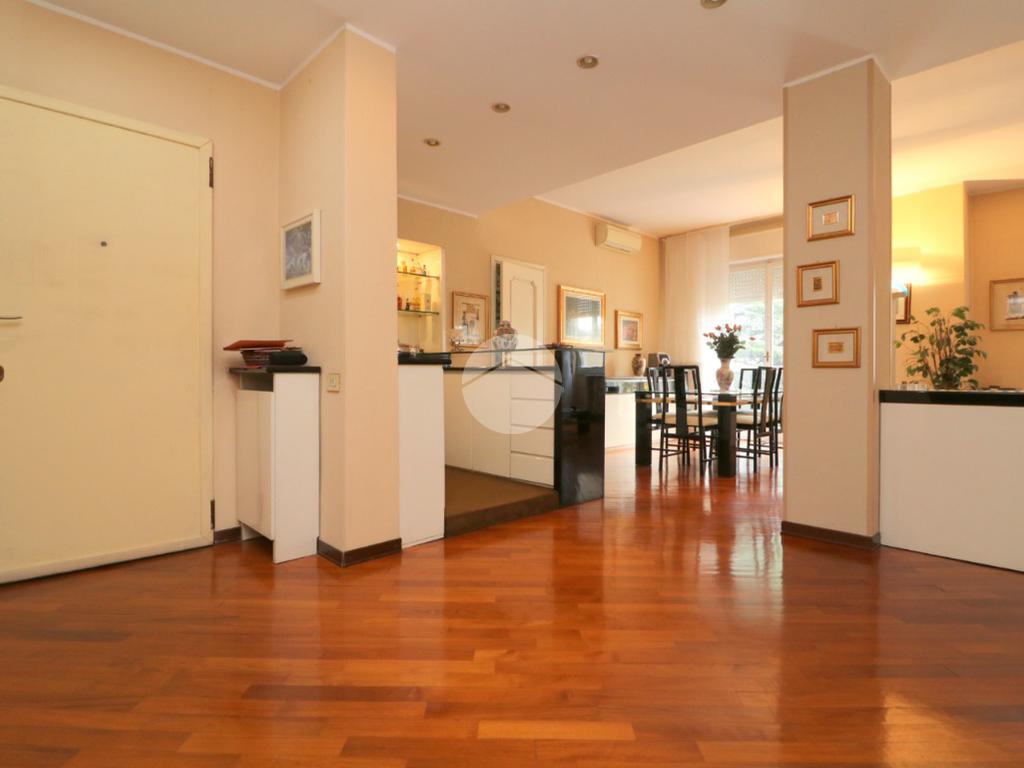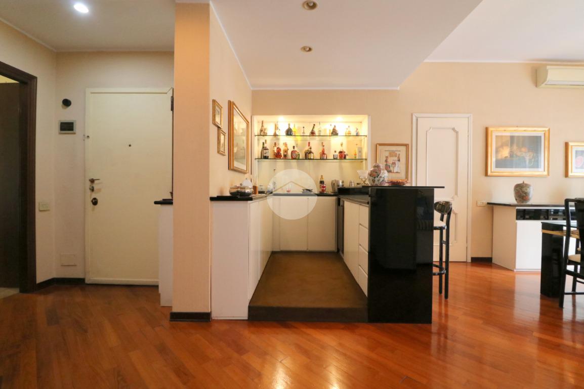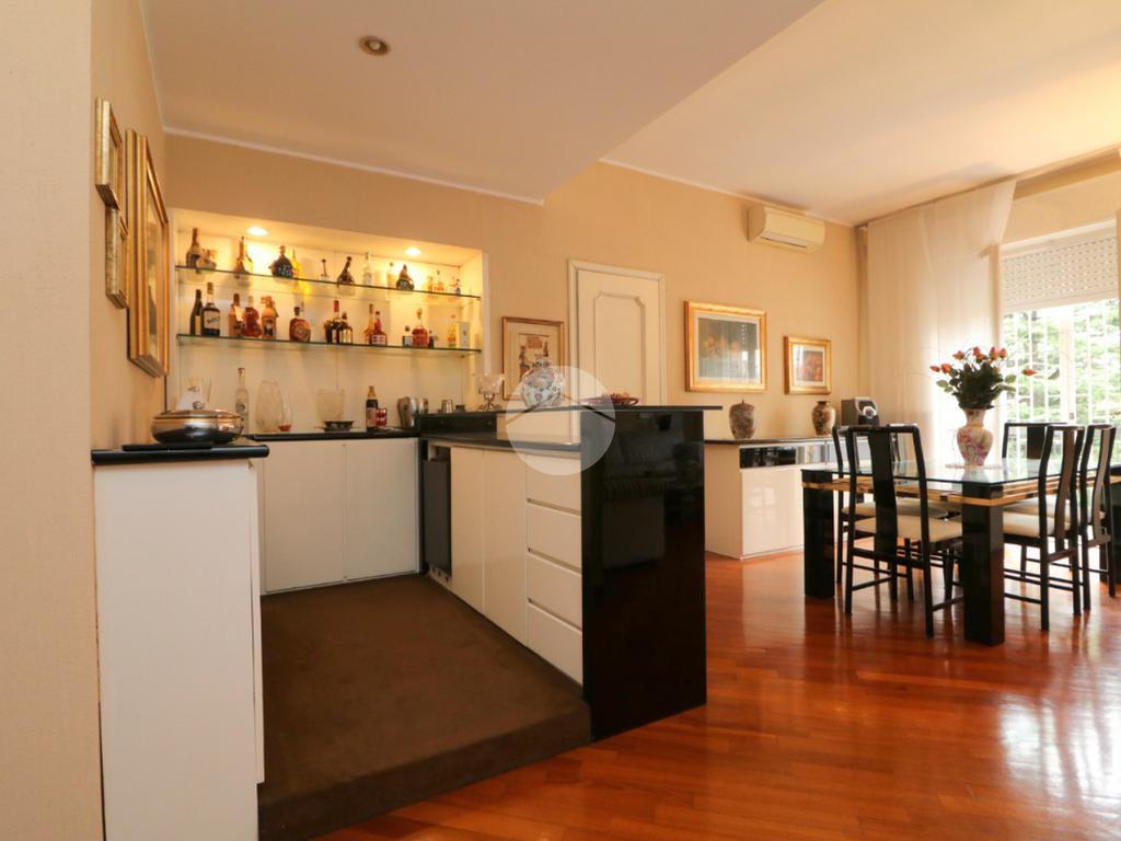 L’ingresso in parquet conduce a un salone doppio, accogliente e luminoso grazie alla presenza di balcone e finestra, arricchito da un angolo bar e da un locale lavanderia di generosa metratura. Sempre all’ingresso è stato realizzato un armadio guardaroba su misura, funzionale e discreto.