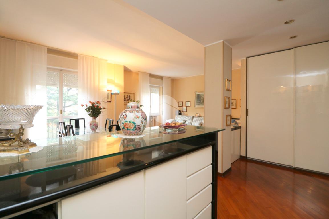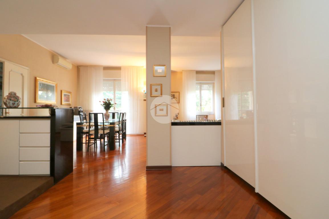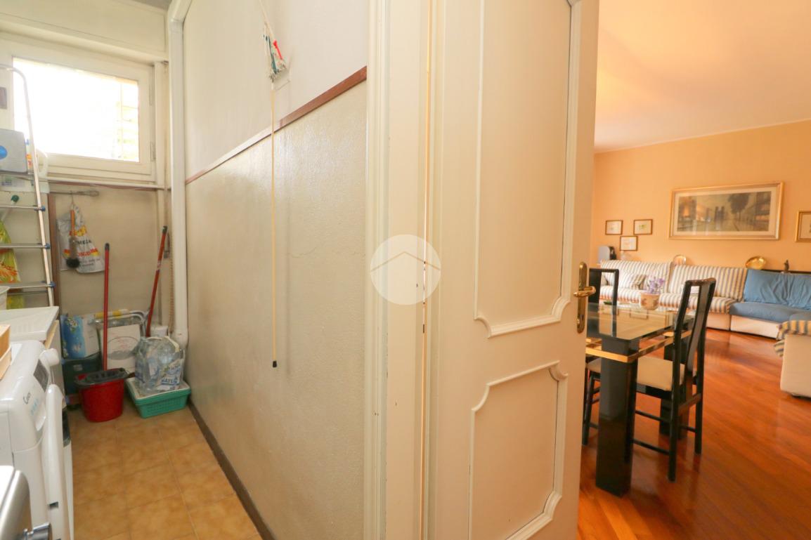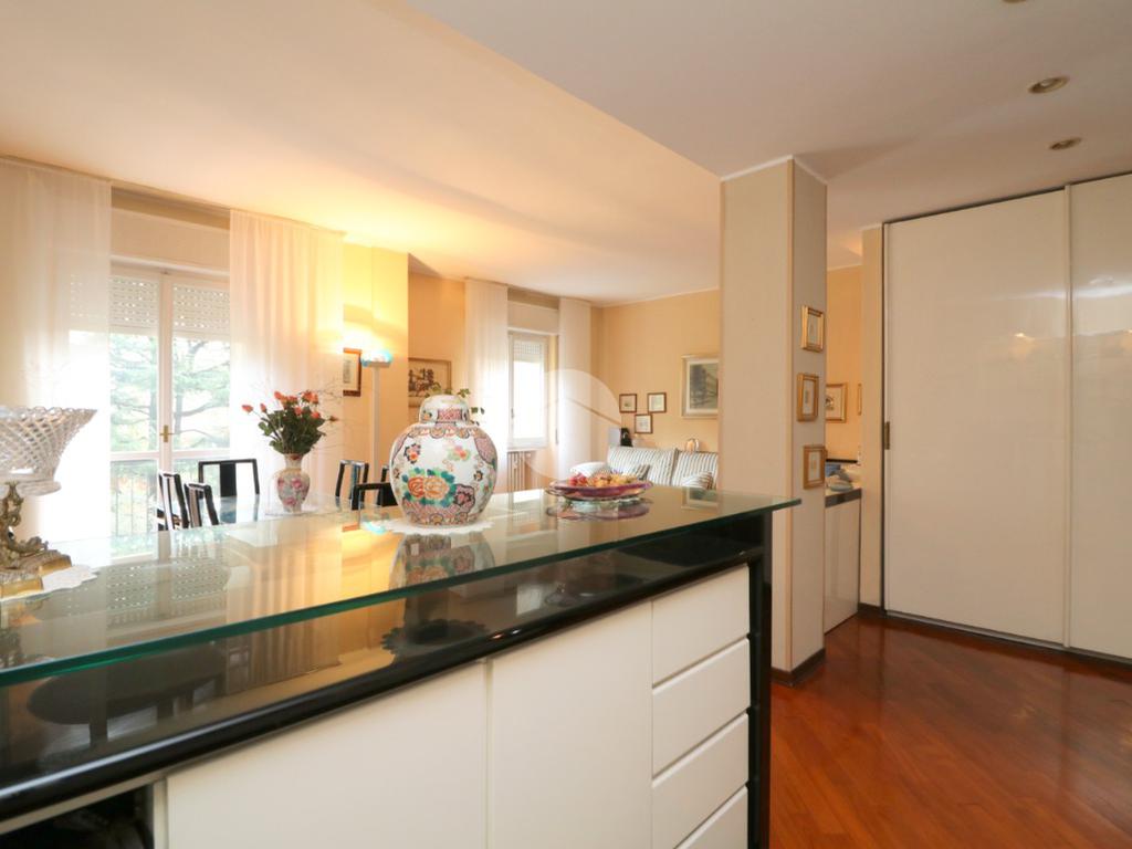 L’ingresso in parquet conduce a un salone doppio, accogliente e luminoso grazie alla presenza di balcone e finestra, arricchito da un angolo bar e da un locale lavanderia di generosa metratura. Sempre all’ingresso è stato realizzato un armadio guardaroba su misura, funzionale e discreto.