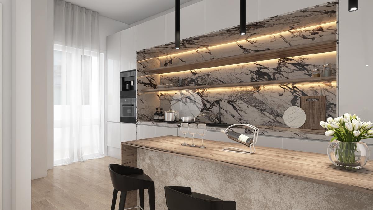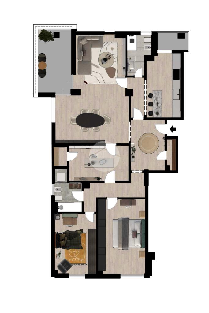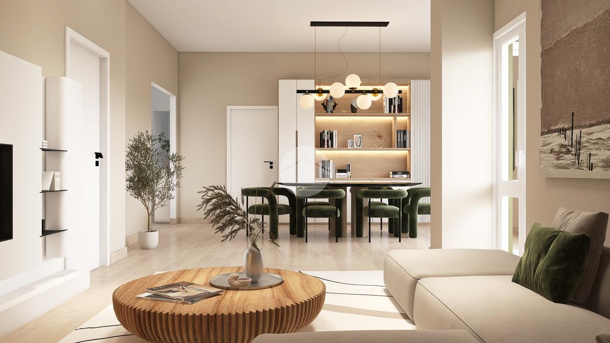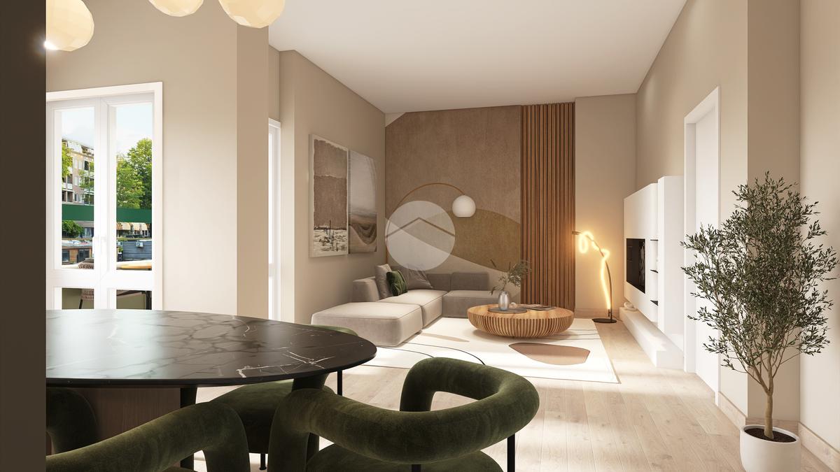 Le immagini renderizzate sono fornite a titolo esemplificativo e mostrano una possibile soluzione di ristrutturazione moderna dell’appartamento. Non costituiscono elemento contrattuale.